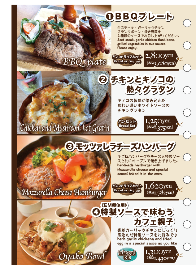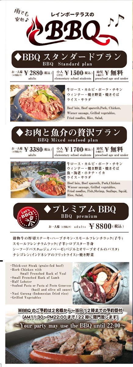 4~100名 ※BBQのご予約は4名様より受付 前日までの予約制 ※各種コース・パーティーご予約承ります。 ご予算に応じた特別プランもOK! (AM11:30~PM22:00までOK! 22:00に閉門致します) 【内容】 穀物牛の厚切りステーキ やんばる若鳥ハーブチキン スモールフレンチラック(子牛) スモールフレンチラムラック(子羊) ロブスター半身 シーフードパスタorジェノベーゼ(バジルとオリーブオイルのパスタ) ナシゴレン(インドネシアのフリットライス) 焼き野菜 小人(小学生)4,250円(税込)/幼児(6歳以下)無料 焼き場スタッフが必要な場合は+5500円となります。